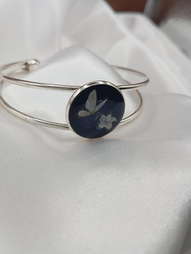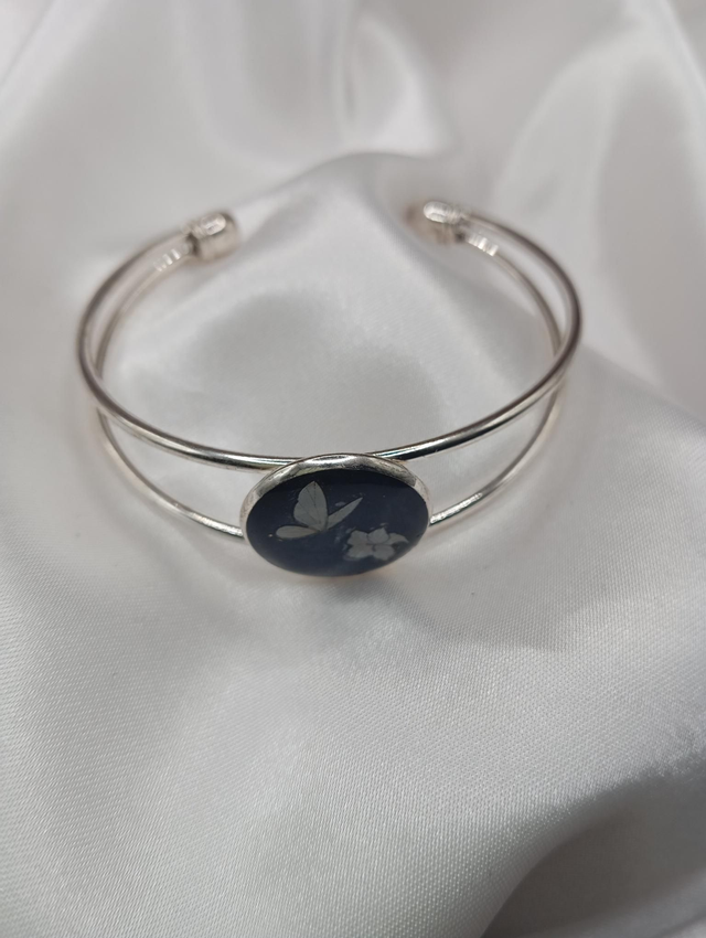 Jonc argenté avec un fond bleu nuit et un graphisme papillon fleur irisé.