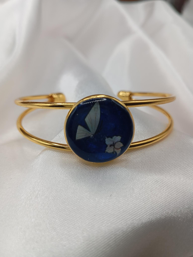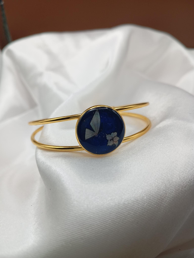 Jonc doré avec graphisme papillon et fleurs irisé sur un fond bleu nuit.