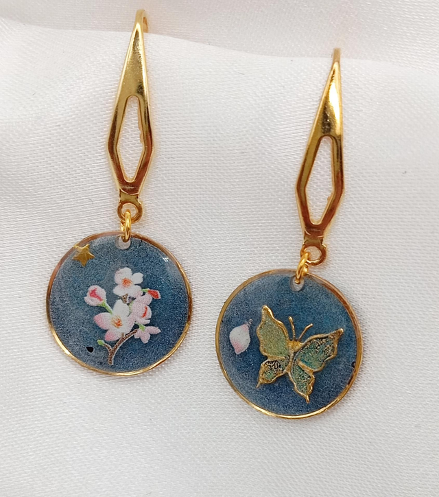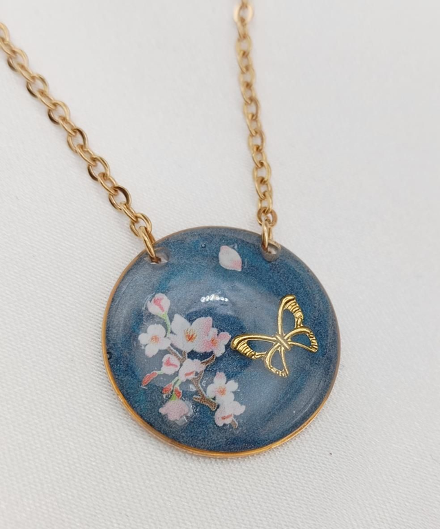 Graphiques papillon et fleurs de cerisier sur résine fond bleu.