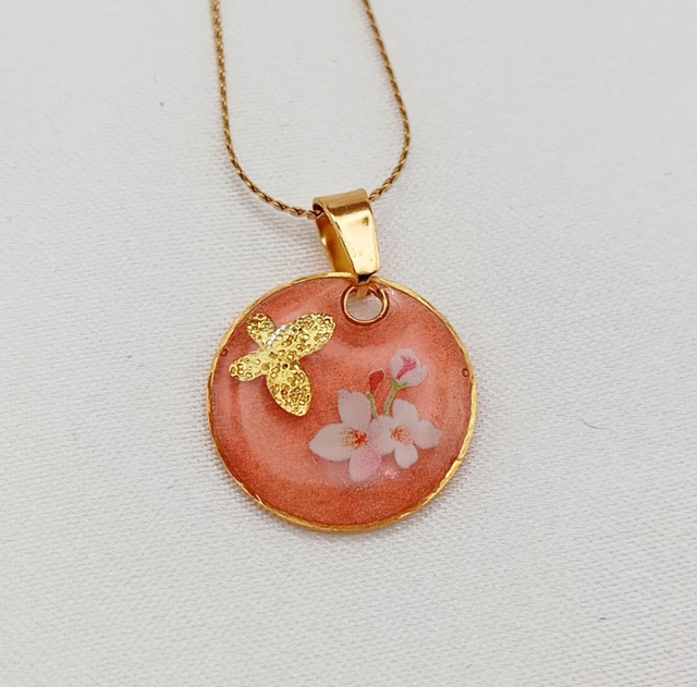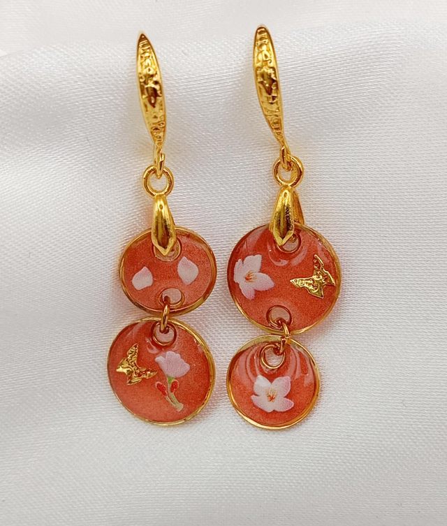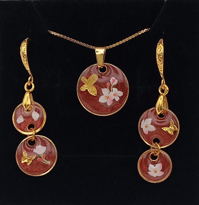 Parure artisanale en résine, composée d’un pendentif assorti à une paire de boucles d’oreilles, réalisée à la main avec soin et passion.