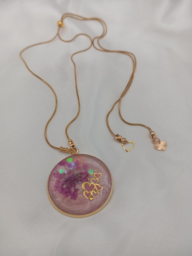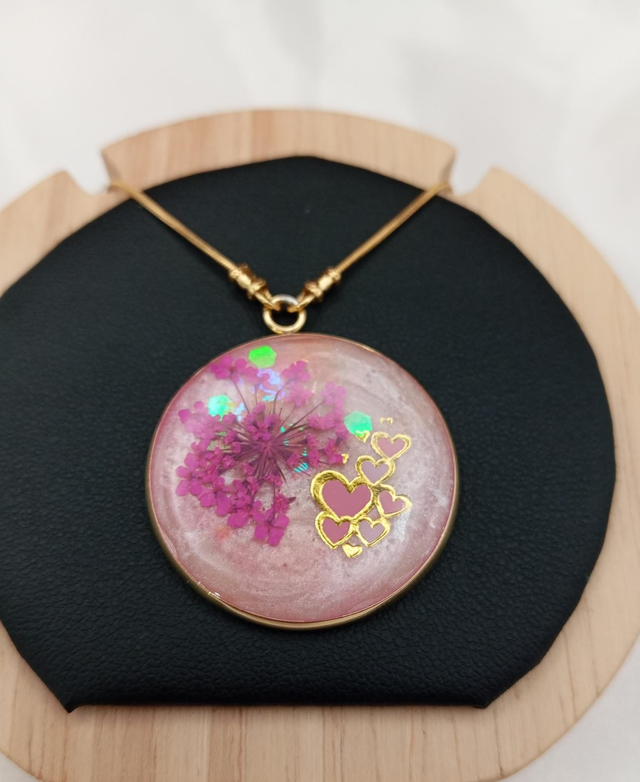 Pendentif médaillon en résine avec fleur de carotte séchées et colorée et graphique cœurs.