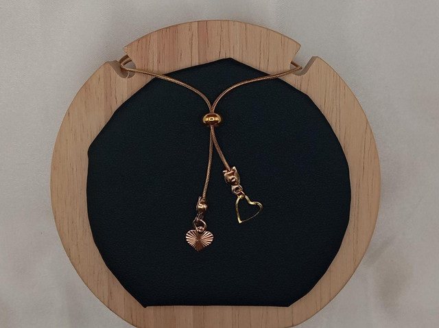 Chaîne en acier inoxydable réglable par perle coulissante et finit par deux petits cœurs.