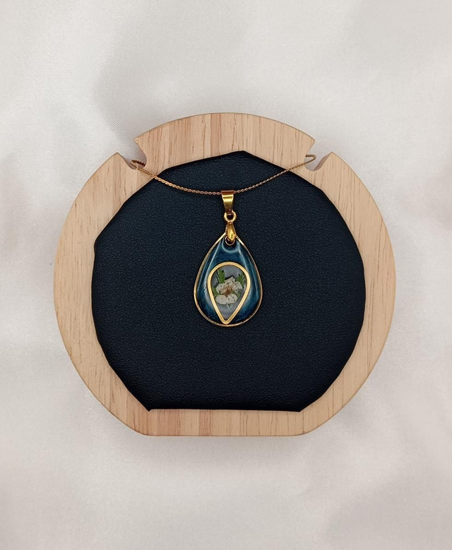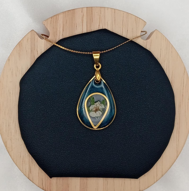 Ce pendentif unique est une création artisanale réalisée à la main, mêlant résine bleue et transparente avec inclusion de fleur naturelle pour un bijou à la fois délicat et intemporel.