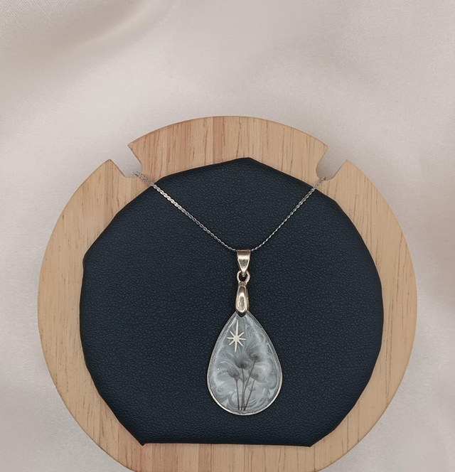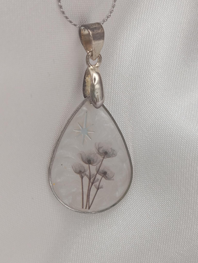 Pendentif en résine, fond blanc, avec une inclusion graphique noire florale.