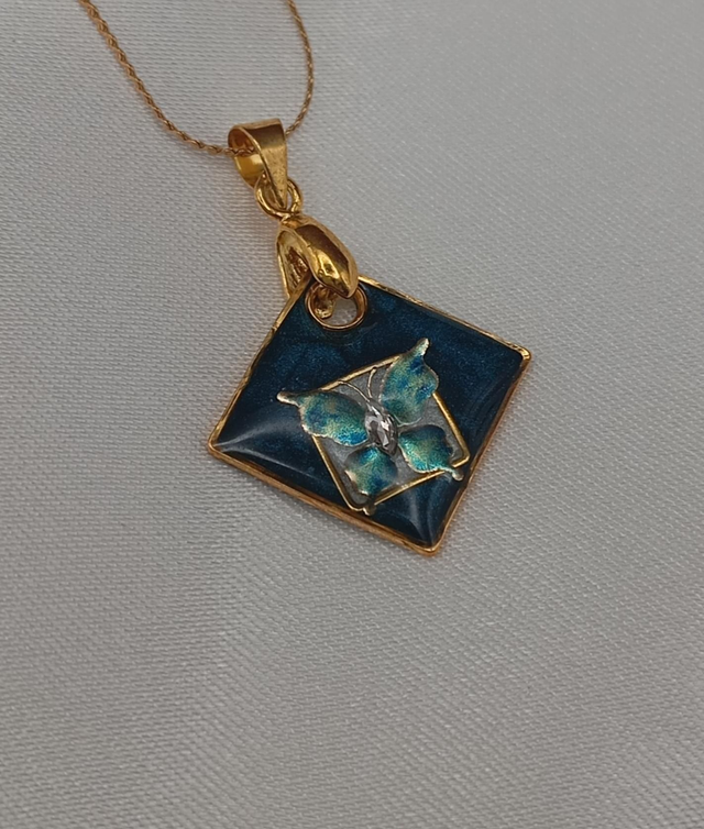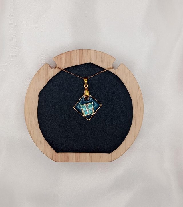 Pendentif est une création artisanale réalisée à la main, mêlant résine bleue et motif graphique Papillon Strass.