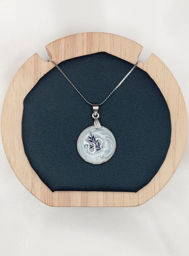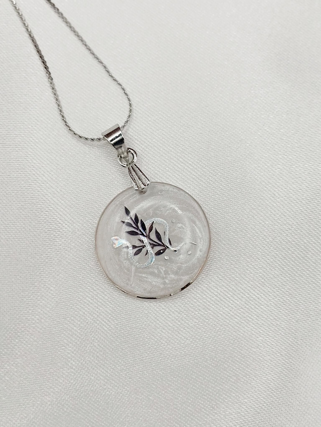 Pendentif est une création réalisée à la main, mêlant résine blanche et motif graphique serpent argenté.