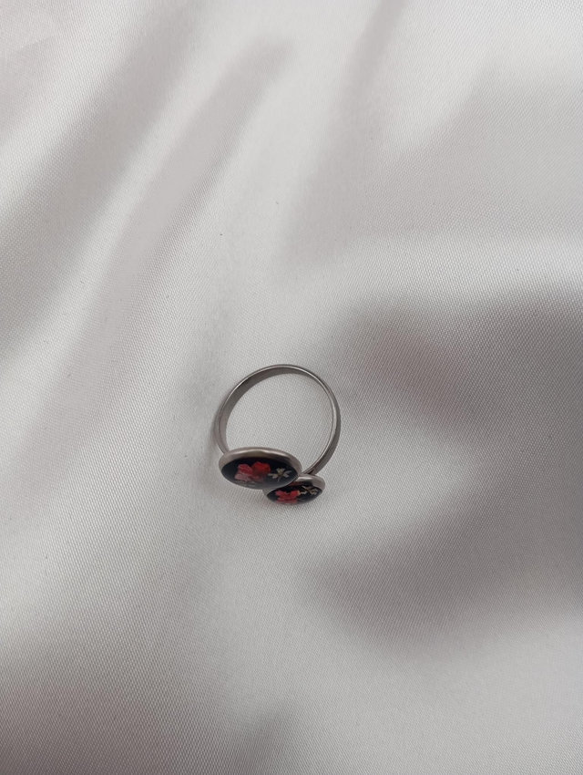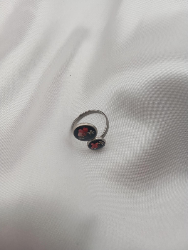 Bague reflet réglable en acier inoxydable double plateau argenté avec insertion vraies fleurs séchées blanches et rouges sur fond noir résine