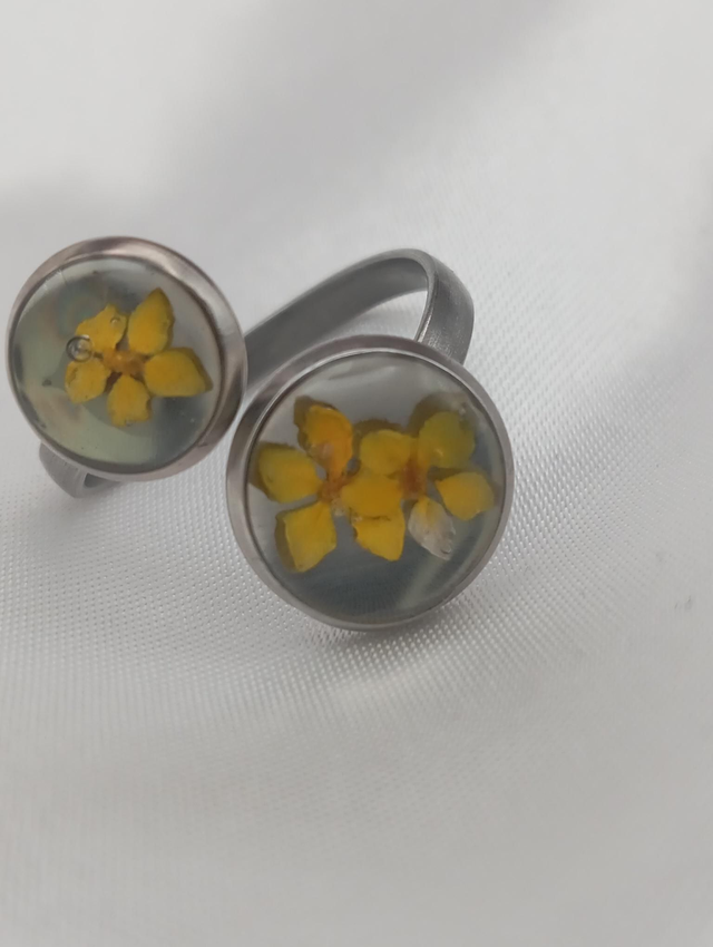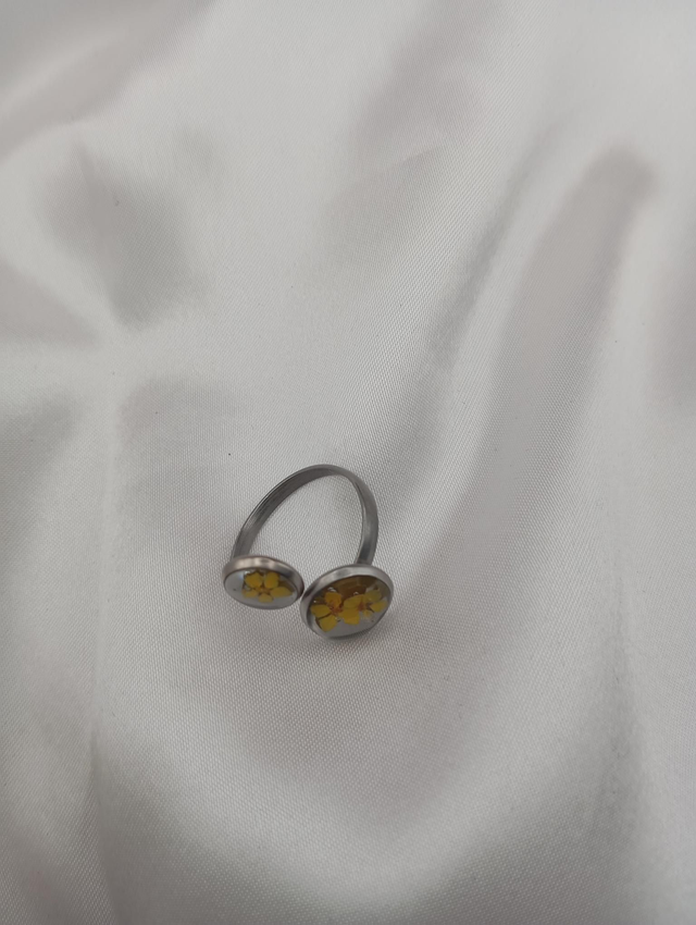 Bague reflet double plateau en acier inoxydable argenté avec inclusion dans la résine de véritables fleurs séchées jaunes