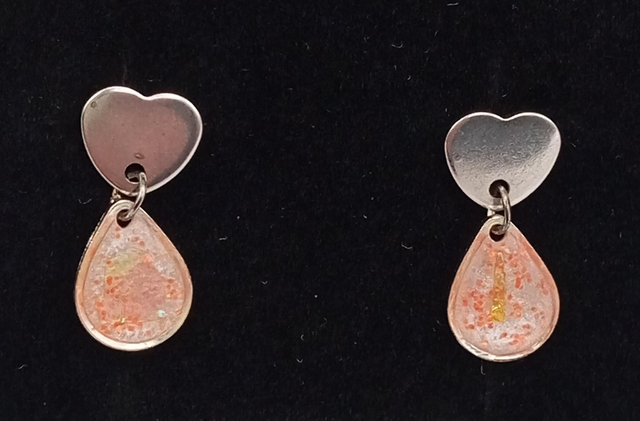 Boucles d’oreilles réalisées à la main en résine, feuille holographique et paillettes dans le ton de rose.